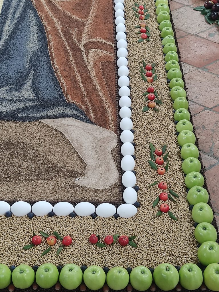 Wenn die drei Spanplatten im Altarraum zusammengesetzt werden, wird noch ein Rahmen aus Äpfel und Eiern gestaltet. Auch mit Gemüse und Obst aus dem Garten runden das Bild neben dem Altarraum ab. Dieser Gestaltungsprozess dauert ca. drei Wochen. Zudem gibt es Frauen, die die Stangen entlang den Sitzbänken und Seitenaltäre gestalten. Weitere Helferinnen stehen in den Öffnungszeiten der Pfarrkirche St. Oswald in Otterswang für Kartenverkauf, Kerzen und Fragen den hoffentlich zahlreichen Besuchern bereit.